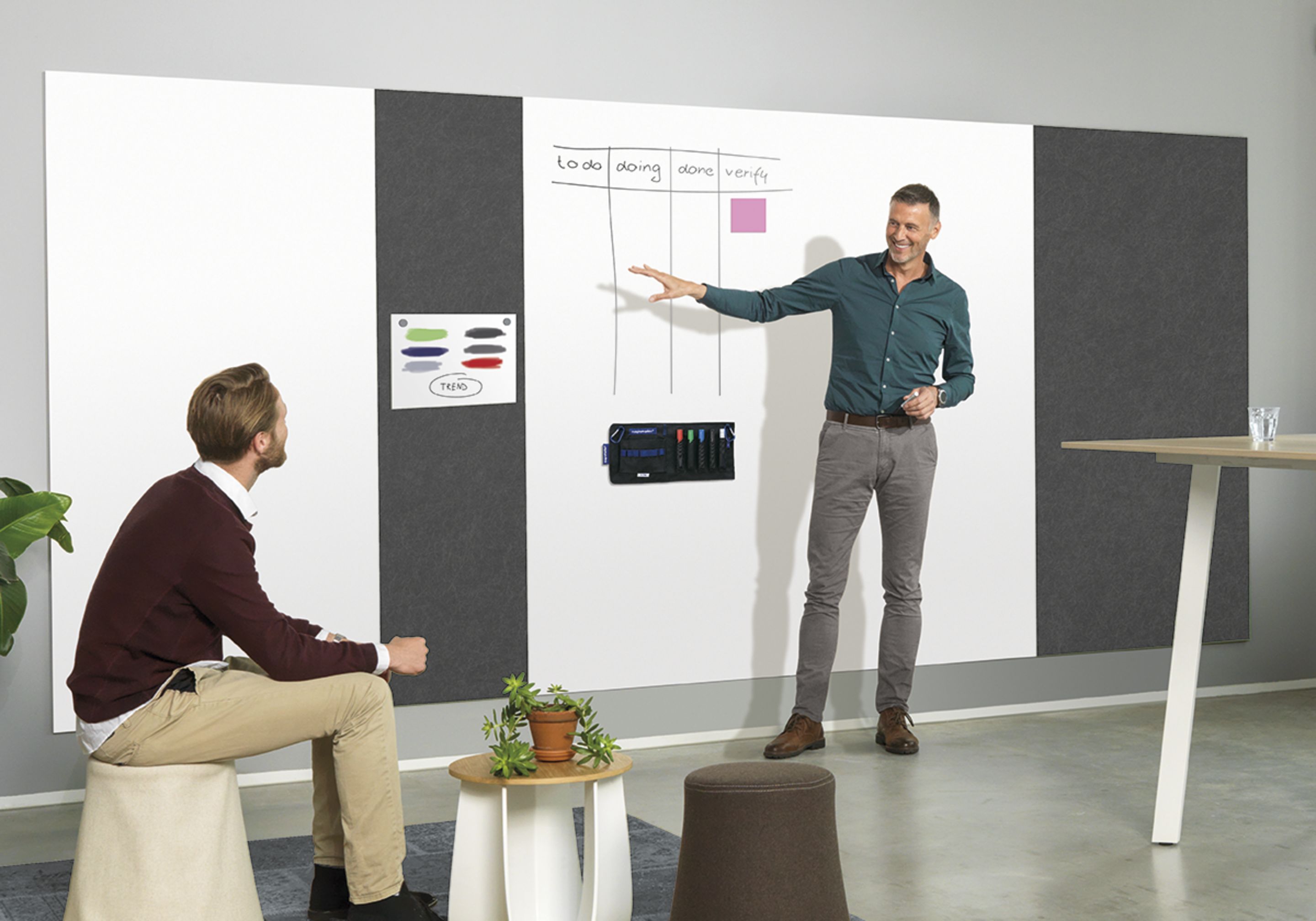 Denken Sie groß + kreativ und schaffen Sie unterschiedlich anmutende Präsentationsflächen mit Infinity Wall X und Infinity Wall X, ACOUSTICS. Ergänzen Sie Ihre Infinity Wall X-Whiteboard-Wand mit den farbigen Pinnflächen der Infinity Wall X, ACOUSTICS. Die Infinity Wall X, ACOUSTICS sorgt für eine bessere Raum-Akustik, setzt farbliche Akzente und dient als zusätzliche Präsentationsfläche in Ihrer Infinity Wall X! Spielen Sie mit den modularen Oberflächen der Infinity Wall X bei vollkommener Design- und Maßfreiheit. Kreieren Sie Ihre Schreib- und Pinnflächen von Wand zu Wand, vom Boden bis zur Decke und schaffen Ihre individuelle, unendlich erweiterbare + akustikoptimierte Raum-Atmosphäre.