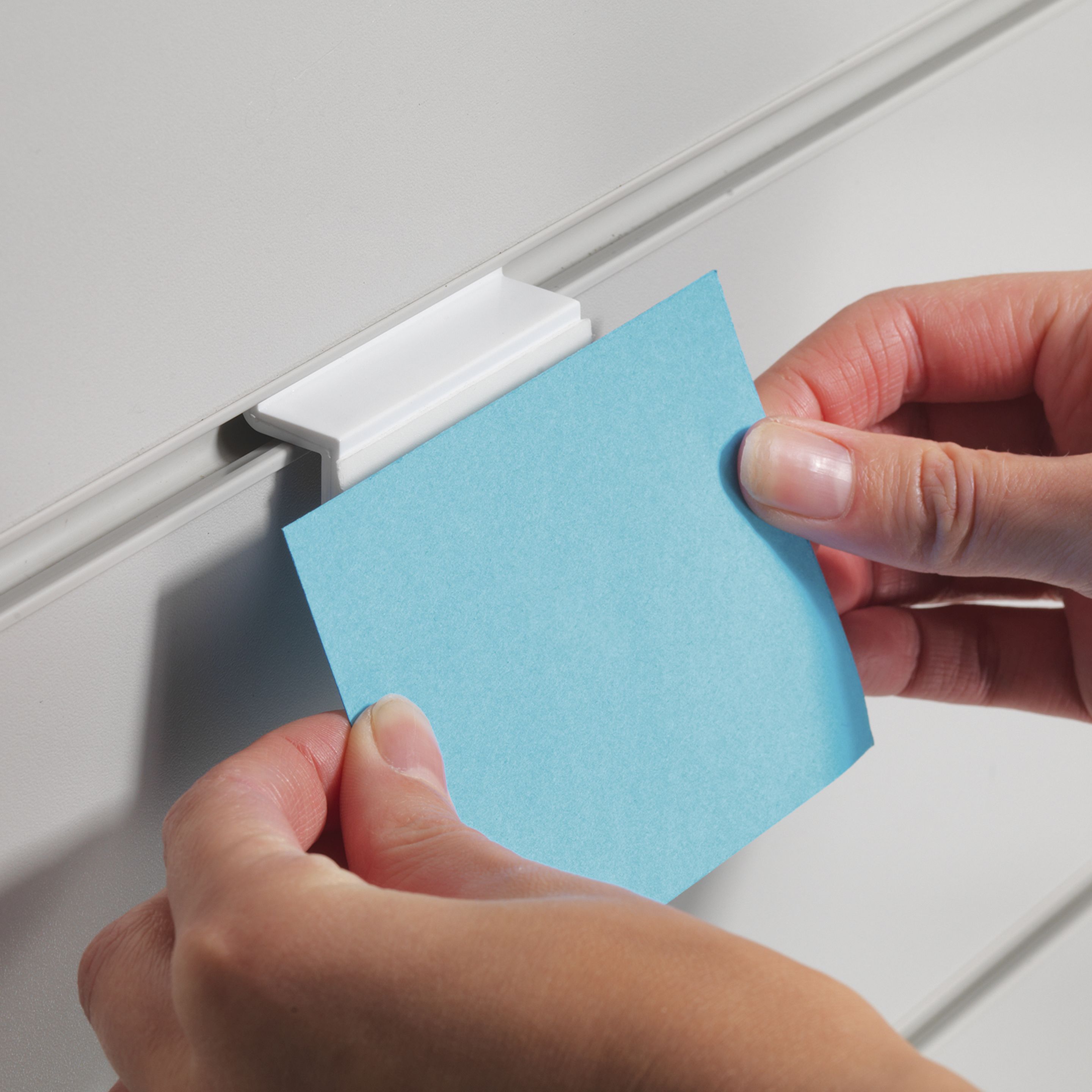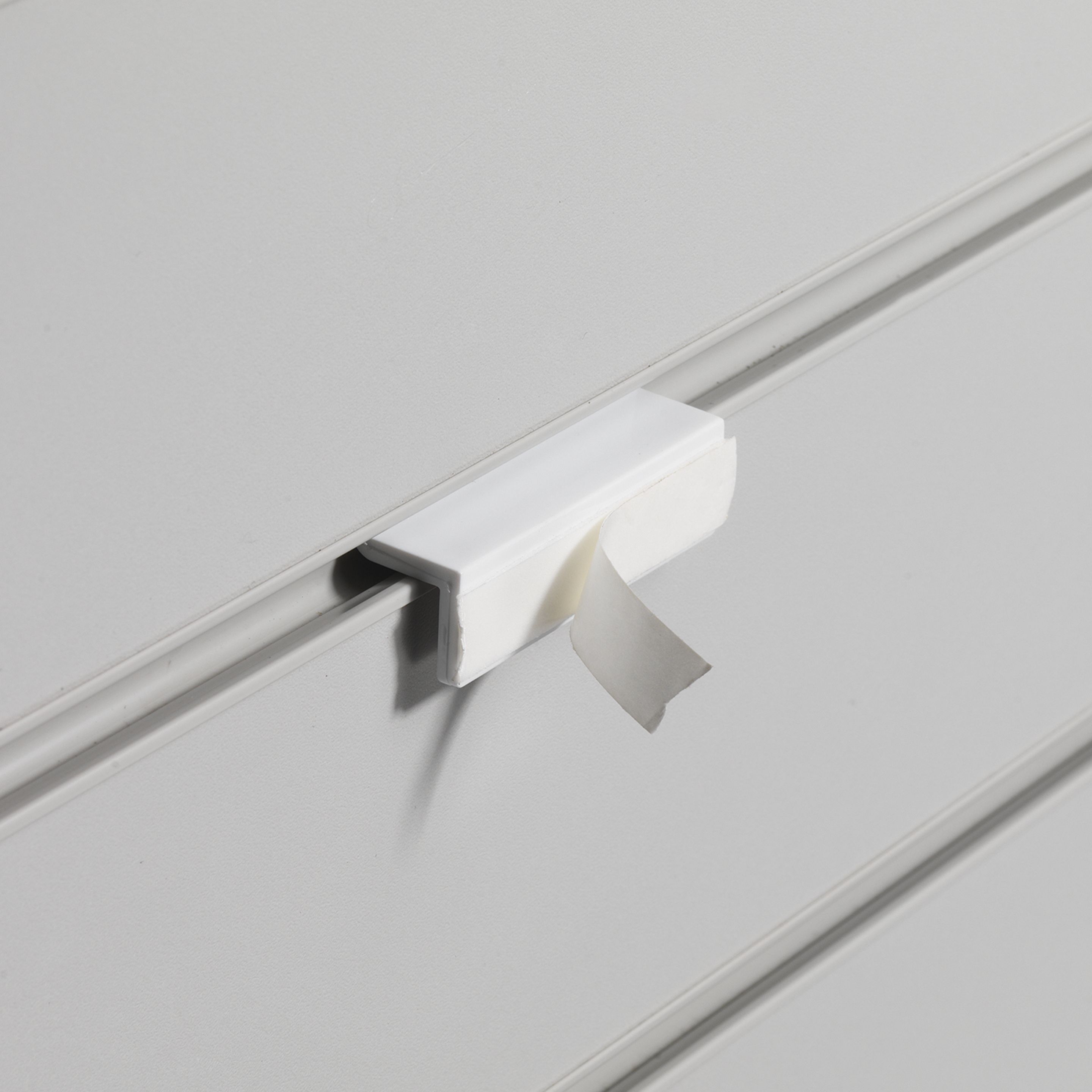 White styrene bracket 60 mm long with permanent self-adhesive tape on the front. For mounting signs in slat walls.